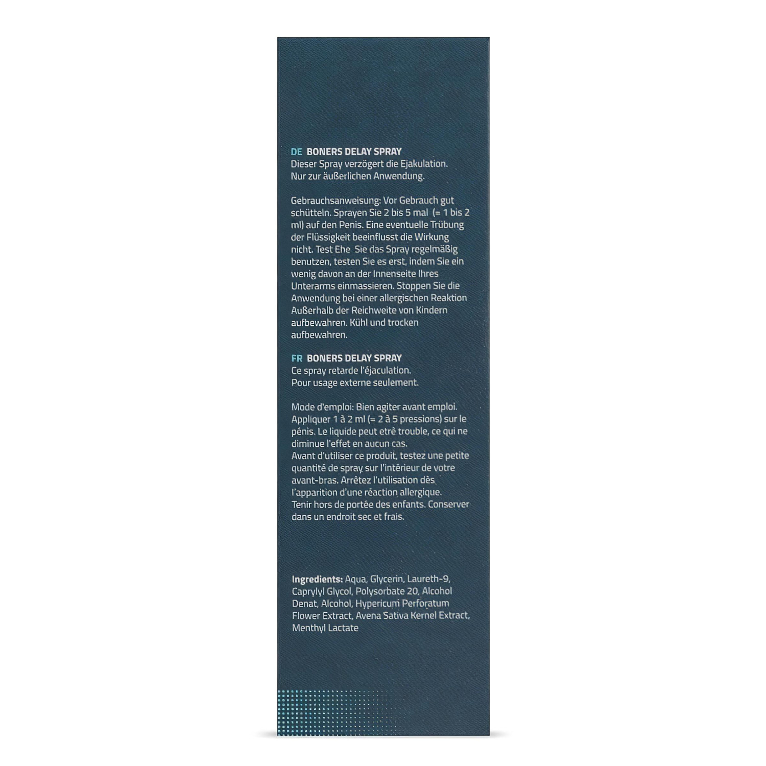Boners Delay Spray is een speciaal voor mannen ontwikkelde spray die het orgasme uitstelt en ervoor zorgt dat jullie langer van elkaar kunnen genieten, terwijl hij overgevoeligheid vermindert.